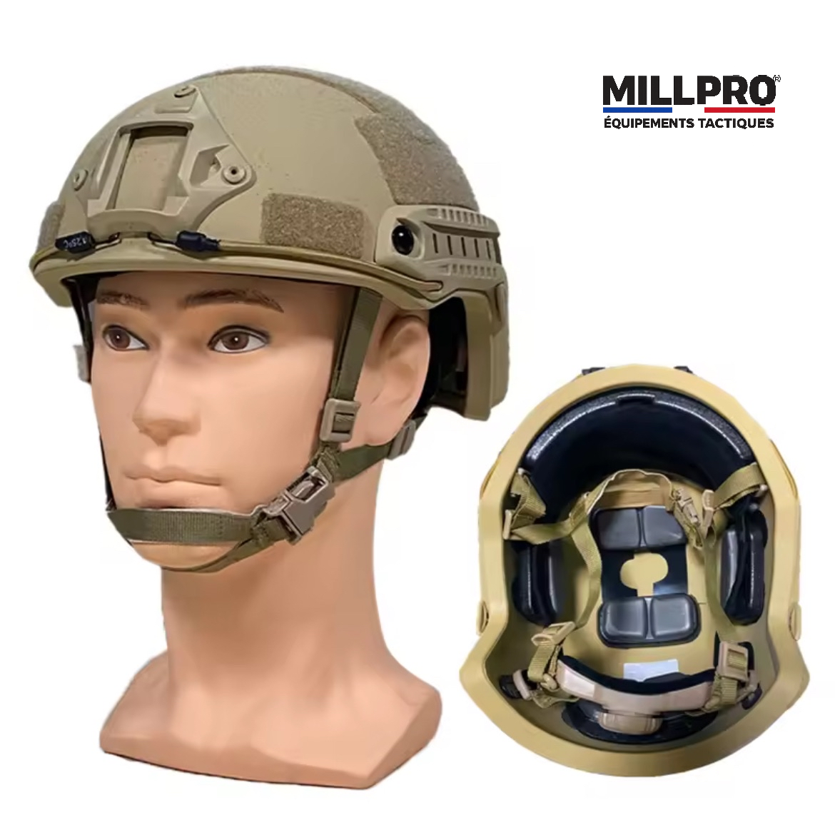 Le casque pare-balles se compose d’une mentonnière sur la coque du casque et d’un système de suspension sur le dessus du casque.